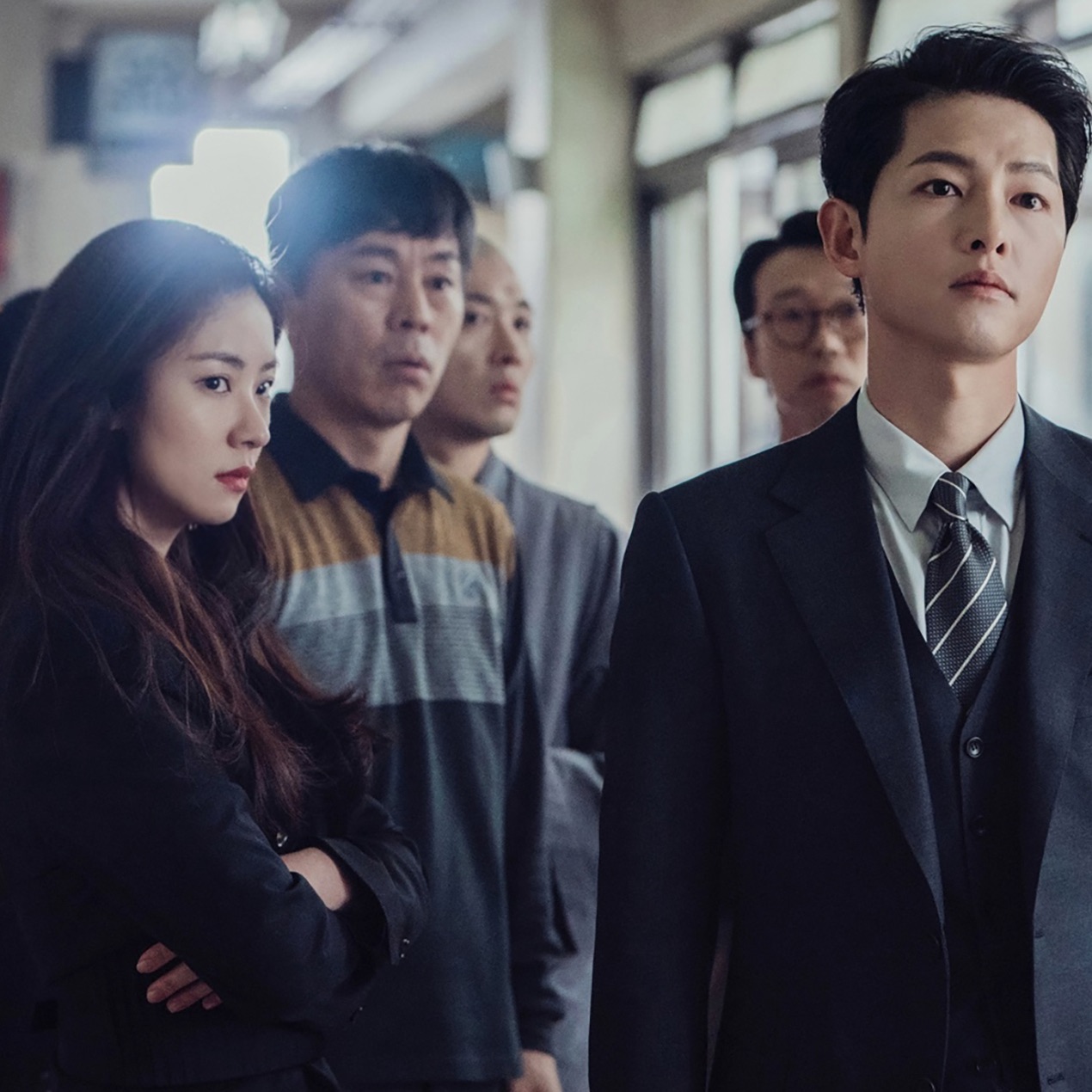 J’ai aimé tous les personnages et je souhaite m’attarder particulièrement sur 5 d’entre eux. D’abord, j’ai été fascinée par SONG Joong-ki alias Vincenzo. J’adore cet acteur. Je pense qu’il a été choisi après son rôle dans Nice Guy car j’ai revu les mêmes facettes en beaucoup plus travaillées ici. La façon dont il est omniprésent face à la caméra et son jeu, rendent son visage d’ange à la fois sombre, froid et charmant. Il forme un parfait duo de choc avec la pétillante et impétueuse HONG Cha-young, emmenée par JEON Yeo-been. J’ai aussi beaucoup apprécié le père de Cha-young, HONG Yuchan, attachant avocat des victimes du système mais aussi intransigeant défenseur des droits, joué à la perfection par YOO Jae-muyng (le méchant dans Itaewon class). Enfin, deux autres acteurs valent nettement le détour pour leurs multiples facettes, la très agaçante et stratège, CHOI Myeong-hui, jouée d’une main de maître par l’excellente KIM Yejin. Le jeune stagiaire naïf, excentrique et très ambivalent JANG Ju-woo, interprété par OK Taec-Yeon.